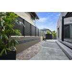 リビングの窓から見ても気持ちのいいお庭をイメージしました。和室から見える一角には、簡単な坪庭スペースをご提案。シックな色合いの壁と床面が和庭の優しい色遣いを演出しています。プライバシー対策として木目のフェンスを設置。床面の石材を組み合わせたアイポイント空間となっています。テラス屋根にはLIXILの注目商品「テラスSC」をご提案。天井材があることでよりプライベート空間の増したお庭に仕上がっています。テラスSCにはオプションでダウンライトを取り付けることができるので夜でもお食事を楽しんでただけます。