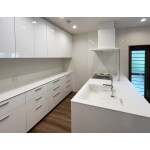 TOTO ザ・クラッソにお取替え。 既存は壁付のキッチンでしたが、壁をとりはらったことで広々としたLDKが実現し、お客様ご希望のペニンシュラキッチンが可能となりました。 扉カラーはオプティホワイトです。 クリスタルカウンターはすりガラスの様な透明感がある仕上がりで、滑らかな手触りです。