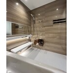 もともと在来浴槽でしたが、今回位置を少し変え、ユニットバスに変更しました。 サイズも1620とゆったりと寛げるサイズです。 壁は高級感のある木目調が美しいノアウッド、床はタイル調のライングレーをお選び頂きました。