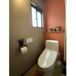 新しいトイレもウォシュレット一体形でご提案、手洗いは外に有るものをご利用されるという事で手洗無タイプへ交換。 ビビットなオレンジ系のアクセントクロスに個性的な小物が映えるトイレ空間に一新。