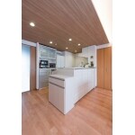 キッチンは、吊戸棚をなくして開放的に。既存の下がり天井を活かした木目調の下がり天井と間接照明をご提案しました。 また、キッチン周辺に収納をまとめたいとのご要望をキッチンと収納が一体になった商品仕様で実現しました。一体になっていることで、新たな家具を置く必要がなくLDKがすっきりとした印象になります。