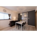 キッチンとの間仕切り壁に貼ったアクセントクロスが印象的なダイニング。ホワイトとダークカラーのバランスが絶妙な、落ち着きのある洗練されたダイニングに仕上がりました。