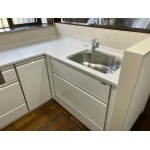 以前と同じ形のL型キッチンです。以前の扉収納ではなく、引き出し収納にしたので、かがむことなく中の物を出し入れできるので使いやすくなっています。 また、キッチン前はパネルにしたのでお手入れもラクにできます。