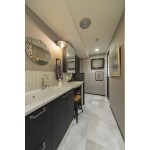廊下に配置した洗面台は、奥行きがスリムなタイプのものをセレクト。 家の真ん中に洗面スペースを持ってきたことで、身支度しながら家族の様子を見守れるようになったと笑顔で仰っておられました。 もともと浴室のとなりにあった洗面室は、洗面台を移設することによって大容量の収納スペースに。 乾燥まで済んだ洗濯物をここで畳んで可動棚に収納まで、一部屋で完結できるようになりとても家事がはかどるようになったと喜んでいただいています。