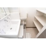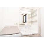 収納を重要視されていたため、洗面台背面に腰壁を造作し可動棚を設置することで すっきりとした収納スペースを確保(リフォーム前は、プラスチック棚を使用されていた) さらに上部のキャビネットや体重計収納の設置を提案。 床は、リフォーム前はクッションフロアで汚れや水漏れによる腐敗を 気にされていましたので、 お手入れがしやすいフロアタイルを提案しました。 (仮に傷が入っても、その部分のフロアタイルのみの交換が可能)