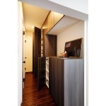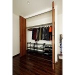 リビングから水まわりに続く廊下の壁に大容量の壁面収納を作りました。施主様の靴のサイズに合わせて奥行きもオーダーし、コレクションされている靴や様々な小物がすべて納まるようにしました。寝室は大容量のクローゼットを新設。こちらも背の高い施主様の体格に合わせて、高めの位置にパイプを設置しました。