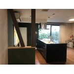 間取りを変更してアイランドキッチンをご提案させていただきました。 出来れば袖壁を撤去してLDKを一体化させたかったのですが大事な耐力壁となっていましたので、壁は撤去出来なかったのですが、筋かいを表しにして開口することで空間が繋がりました。
