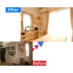 壁の一部にカウンターデスクと飾り棚を造り付け。 みんなが一番長く一緒に過ごすリビングに高さも広さもオリジナル仕様。カウンターの棚は飾りものを置くもの可能なように見せれる棚に。 壁の補修は新たに珪藻土を塗ることで、今までのビニルクロスと違った快適な空間になった。