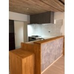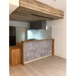 シンク側正面の壁を天板の上高さまで解体し、リビングを見渡せるように仕上げました。 残した壁に造作で木のカウンターテーブルを設置しました。 キッチン天板の高さは既存が85cmでしたが、90cmの仕様でお選びいただきました。 腰に負担がなく、とても広々とした作業スペースになっています。