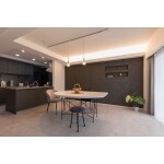 モノトーンのモダンな空間を包みこむ、やわらかな光が印象的なコーブ照明。女性プランナーからご提案した照明プランが、ホテルライクな高級感を演出し、気分も落ち着く心地よいダイニング空間が広がります。