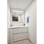 1100mm幅の洗面空間にぴったりフィットした、ワイドカウンターは一時置きもできる余裕のスペースが魅力的です。浴室と同様ホワイトカラーでまとめた洗面は明るく清潔感のある空間が広がります。