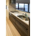 リビングから目隠しされたパントリーを持つ収納力のあるキッチン