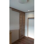 玄関と洋室を仕切るために、特注で片引き戸を新設しました。 天井までの扉にしたことですっきりとした印象を与えます。 和室の引違襖も小壁を起こし、片引き戸にしました。