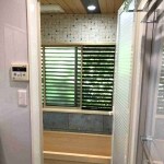 腰壁は桜色が入った伊豆石で施工致しました。 床下には断熱材のスタイロフォームを入れ、寒さ対策をしております。 床のタイルはLIXIL様のひんやりさせず、滑りにくい「サーモタイル クォーツ」です。 また、天井にPanasonicの浴室乾燥暖房機も完備しました。