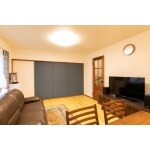 床材はパイン材を採用し明るい印象に。 襖をアクセントカラーの紺色で引き締めシックな雰囲気になりました。TV台を廊下側に移動し収納力もアップしつつスッキリとした印象になりました。