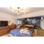 自宅では創作料理を囲み、お酒に舌鼓を打ち、おうち時間を大切に過ごすオーナー夫妻。3LDKと細かく仕切られた間取りの居室から、オーベルジュのような自分たちの為だけの「食」を楽しむ贅沢な空間使いをされたいとのご相談を承りました。平面のご提案に加えて、お好みであったヴィンテージライクなテイストをインテリアプランに落とし込みました。ヘリンボーンフローリングを施工するため、直床カーペット仕上げの床を二重床にし、遮音性能を確保。二重天井は高さを活かすため、コンクリート現しに。お互いがどこにいても何となく時間と空間が共有できるよう建具・間仕切りは最小限にゆるく仕切りました。生活音に配慮が必要なためトイレは一番奥まったところにレイアウト。寝室は南北の通気性を高めるため室内窓を設けています。デザインと居住性能を両立させました。