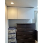 周りの色味と違和感の無い様にホワイトの吊戸棚を洗濯機上と寝室のタンス置場の上に設けさせて頂きました。