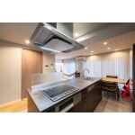 キッチンの間仕切り壁を撤去し、LDKを見渡せるよう90度キッチンの向きを変えました。アイランド型に配置することでキッチンに家族が集まりやすくなり、団らんの中心になりました。また、LDKから水まわりへの動線もスムーズになり、お子様達もキッチンを回遊するようにのびのびと遊んでいます。キッチン本体は、機能性・デザイン性が高く、重厚感のあるグラフテクトのキッチンです。キッチン背面の家電収納や作業カウンターも同じ面材で作られたセット製品のため、空間の一体感、高級感を醸し出しています。床は、オークの無垢材を使用した挽板のフローリングを採用。肌触りが無垢のように柔らかで意匠性もよく、床暖房にも対応しています。