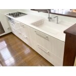 ご要望に加え、衛生的な機能として 以下の設備をご提案しました。 ・タッチレス水ほうき水栓+「キレイ除菌水」 ・電動昇降式吊戸棚(食器乾燥庫・照明)