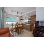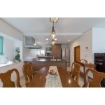 明るい空間に家具調キッチンとダイニングテーブルで落ち着いた印象も持たせたダイニング。