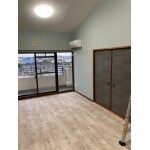 薄いブルーの壁紙にしました。 床はクッションフロアへ貼り替え。 ワンちゃんの足にも優しくお掃除の楽ちんです。 シャープ空気清浄付きエアコンを設置しました。 快適な空間になりました。 エアコンはこどもみらい支援住宅補助金対象工事です。