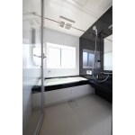 モノトーンで高級感のある浴室をご提案しました。透明ガラスの入口ドアを採用したことで、脱衣室との一体感が生まれ、圧迫感がなく視覚的にも広く感じられます。洗面台と脱衣室を別の空間に設けているため、脱衣室のドアを閉めることでプライベートな空間を保つことができます。