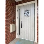 旧来のアルミ色から木目柄のナチュラルテイストの扉デザインと唐草飾りがアクセントの玄関ドア。 断熱性(ペアガラスサッシ)、防犯面でも優れています。