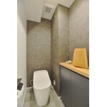 無垢材のカウンターを加え、落ち着いた印象のトイレ