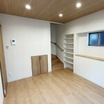 リビングに階段を設けることによって、空間を有効的に利用しました。各所に収納スペースも取り入れました。