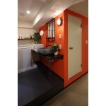 玄関から居室へ続く扉は将来の安心のため自動ドアを採用。自動ドアの先は「ととのえるの間」とし、洗面・洗濯・室内干しスペース等をひとつの空間にまとめました。それにより、ウォークインクローゼットが隣接するメリットを最大化した生活導線を描くことができます。リビングは、旅館にいるかの様な非日常空間にするため、中央を就寝スペースとする大胆な間取りを計画。キッチンカウンターは書斎を兼ねており、キッチン自体はミニマムに仕上げました。お施主者様にとって「入浴」は創造力をかきたてる大切な時間。そのため浴室は広げています。朱色をシンボルカラーとした、お施主様のためのセカンドハウスが完成しました。