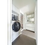 住まい全体をグレーとホワイトを基調にスッキリとデザイン。洗面所は清潔感溢れるホワイトで統一。大きなミラーとシンク、収納スペースが一体化した洗面化粧台は汚れが付きにくく、毎日のお掃除も簡単