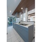 回遊できる便利な動線になるようキッチンをご提案しました。LDKを一部増築したことで、開放感のあるオープンなキッチンになりました。 背面は、カップボードに加えて増築して広くなった分、奥様ご希望のパントリーを設けて収納を充実させました。 キッチンとLDは床を貼り分けフロアタイルを施工。天井は、長手に沿って天井を下げてLDK空間のアクセントとしました。キッチン扉のブルーグレーのカラーをLDK空間の各所に取り入れて、統一感を持たせました。