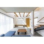 ・リビングに吹き抜けを採用 ・LDKとウッドデッキの床を同じ高さとし、LDKとウッドデッキがひと続きのリビング空間となる ・LDK及び玄関ホールの壁に調湿効果のある漆喰を使用 ・床は無垢フローリングを使用 ・吹き抜け部分は将来、個室として改修可能