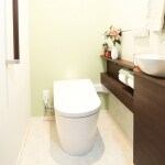 器具はTOTOの新商品である「ネオレストLS」をご採用いただきました。 ネオレストLSは、清潔・きれいの機能はもちろんのこと、デザインの美しさも大きな魅力のひとつです。 タンクレス便器と家具のようなキャビネット・二段カウンターで、スッキリとした空間を実現することができます。 キャビネットのカラーは既存の建具・家具との色合いを調和させるダルブラウンを、壁紙は奥様お好みのグリーンをメインに選定を行いました。 ブラウンとグリーンからなる落ち着きある中にもすっきりとした爽やかさを感じる空間に、意匠性のあるデザインの便器が備えられ、より一層、上質で華やかな空間へと生まれ変わりました。
