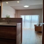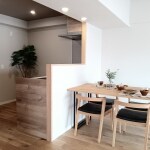 対面式キッチンにすることのメリットとして、キッチンに少しだけ壁を付ける事で、キッチンのごちゃつき感を隠すことができ、さらにキッチンのお色を、床と同系色にすることで、LDKに統一感を出すご提案しました。