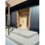 玄関は奥様お気に入りの、最新の電子錠タイプのおしゃれなタイプを選定。玄関まわりのみ、外装も木目調にして別空間を演出。 玄関ポーチについては、現状が不必要に大きかったため、外構のバランスを考慮しつつ、最適な形でプランしました。 ポーチの出幅や、ナナメの場所の配置なども現場にて打ち合わせさせて頂きました。 アイアン調の手すりについては、最初の打ち合わせでは削られたところでしたが、タイルを施工してから、「やっぱり欲しいかも・・・」ということで安全性を考慮し、急遽設置することとなりました。 全体的に満足して頂けて何よりです。