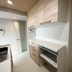 吊戸を無くした分、スライド収納とすることで、 収納力が向上しました。淡い木目調を採用し、木の優しさを感じるナチュラルな空間となりました。