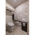 コンパクト設計のタンクレストイレで広く感じるトイレ空間。ボタニカル柄の輸入クロスがおしゃれで印象的です。