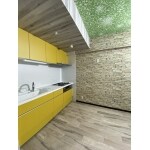 個性的な配色ですがキッチンのイエローと天井クロスのグリーンが調和して素敵なお部屋になりました。 クロスは同方向になるように貼っていますので、纏まりのある印象になりました。