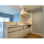 工事前は洋間が2部屋、ダイニングキッチンと和室が1部屋、浴室はトイレが一体になったタイプでした。今回、キッチンは対面式へ変更し、浴室、トイレ、洗面は独立で設けることができました。ダイニングと隣接する洋間は3枚連動引き戸で区切られていますが、全開するとひと続きの部屋として利用できます。また、各部屋に収納を設け、収納スペースを確保しました。リフォームに合わせて断熱性の向上も図っています。以前はコンクリート壁に直に壁紙が貼られており、カビが発生していました。今回は外壁に面したコンクリート壁に発泡ウレタンを吹き付け、断熱層を作り、新規に壁を立て、結露・カビを抑える工夫をしています。壁紙のブルーグレーは、複数のブルーグレーサンプルをとり、よりお客様のイメージに近い色を採用しました。ブルーグレーの空間に馴染みやすいよう、建具・水まわりをホワイトに統一。フローリングはウォールナット色にし、落ち着いた雰囲気に仕上げました。