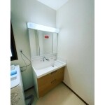 入浴時の快適性はもちろんのこと、日々のお手入れや使い勝手、経済性など性能の高いシステムバスをご提案させていただきました。洗面台の壁際は水がはねても壁紙が傷まないようにキッチンパネルを設置しました。