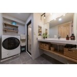 トイレのドアを移動し、壁面のスペースができたことで、造作風の洗面化粧台をつくることができました。カウンターは「TOTO マーブライトカウンター」に洗面下部はウッドワンの棚板を付け、サイドにはニッチを造作。無機質な中に木の温もりを合わせ、シンプルでスタイリッシュな空間に仕上がりました。