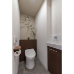タンクレストイレにコンクリート調のクッションフロアをあわせ、スッキリとしたかっこいいトイレ空間です。