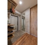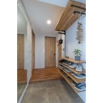 玄関は既存の下駄箱を撤去しオープンタイプのシンプルな収納棚を設置。玄関が広く感じられ、木目×グレーでまとめたクールで温もりのある空間が広がります。