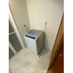 洗濯機より左右にはみ出した防水パン。この防水パンを小さくしたら右側の棚を置いてある空間がさらに有効活用できるのではないかと施主様からのご要望でした。ご要望通り丁寧に工事をして行きます。また、床・クロスの張り替え工事も行います。