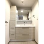 TOTOのオクターブです。色はホワイトウッドです。洗面ボウルは水栓の位置が高いので、蛇口まわりが汚れにくく深さと奥行きを確保した形状なので、広くゆったり使えます。三面鏡になり、収納力があがりました。また、トールキャビネットにもたっぷり収納できます。