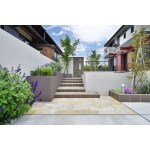 工事前は急な階段と、前面道路側には擁壁が立てられていました。お孫さん家族が遊びに来られるということで駐車もたくさんできるように車庫拡張も行いました。乱形石、豆砂利洗い出し、タイルを使用した門周りを施工しました。左手前にはゆっくりのぼれる階段を、車庫奥右側にはゆるやかなスロープを設けました。前面道路から玄関まで1mを超える高低差があったので、かなり長いスロープが必要でした。一直線では距離が足りなかったので、2,3回折り返したスロープになっています。車庫やアプローチ両脇には花壇を設けて、華やかに彩ってくれています。車庫も拡張したので、普通車がゆったり3台追加で停められます。
