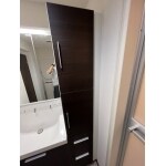 洗面化粧台本体の幅は小さくしましたが、収納スペースが多くなりましたので、お風呂上がりのバスタオルなどを収納する部分が出来ました。鏡の後ろも収納となりますので、一枚鏡だった施工前のモデルとは収納力が違います。