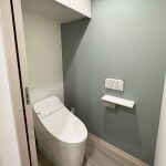 お掃除が楽なウォシュレット一体型便器を採用。また、吊戸棚で収納力も向上しました。床面に合わせたグレー系のアクセントクロスで、おしゃれで落ち着いた空間に。入口は引戸にして、空間を有効活用できるようにしました