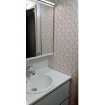 お掃除面でも収納面でもラクラク使いやすい商品をご提案させていただきました。 凸凹の陰影が美しいタイル調のテクスチャーで丸い洗面ボールが印象的な洗面に交換しました。継ぎ目のないボール一体型カウンターでサッと拭けてお掃除が楽々。ミラーキャビネットには、置き場所に困る家電や日用品を、出し入れしやすくたっぷり収納でき、洗面室がすっきり片付きます。出し入れしやすいスライドタイプの収納です。 洗面空間はクロスとクッションフロアも交換し、洗面のタイル調のデザインに合わせてデザイン性の高いクロスに交換しました。